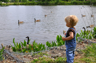 (Saying "byyyyeeee ducks" - these pics are a few weeks old, but I had to put them up because our darn dryer just ate those cute little overalls. Marc was the one to break the news to me...I guess they got caught in the lint trap and one of the straps just ripped right off. I was about to retire them anyway, but they were pretty much my favorite little Nora outfit, so I was pretty bummed. )