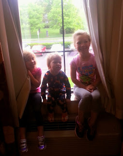 Sitting in the window at the hotel. These kids think staying in a hotel is about one of the most exciting things someone can do.
